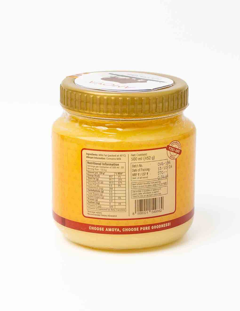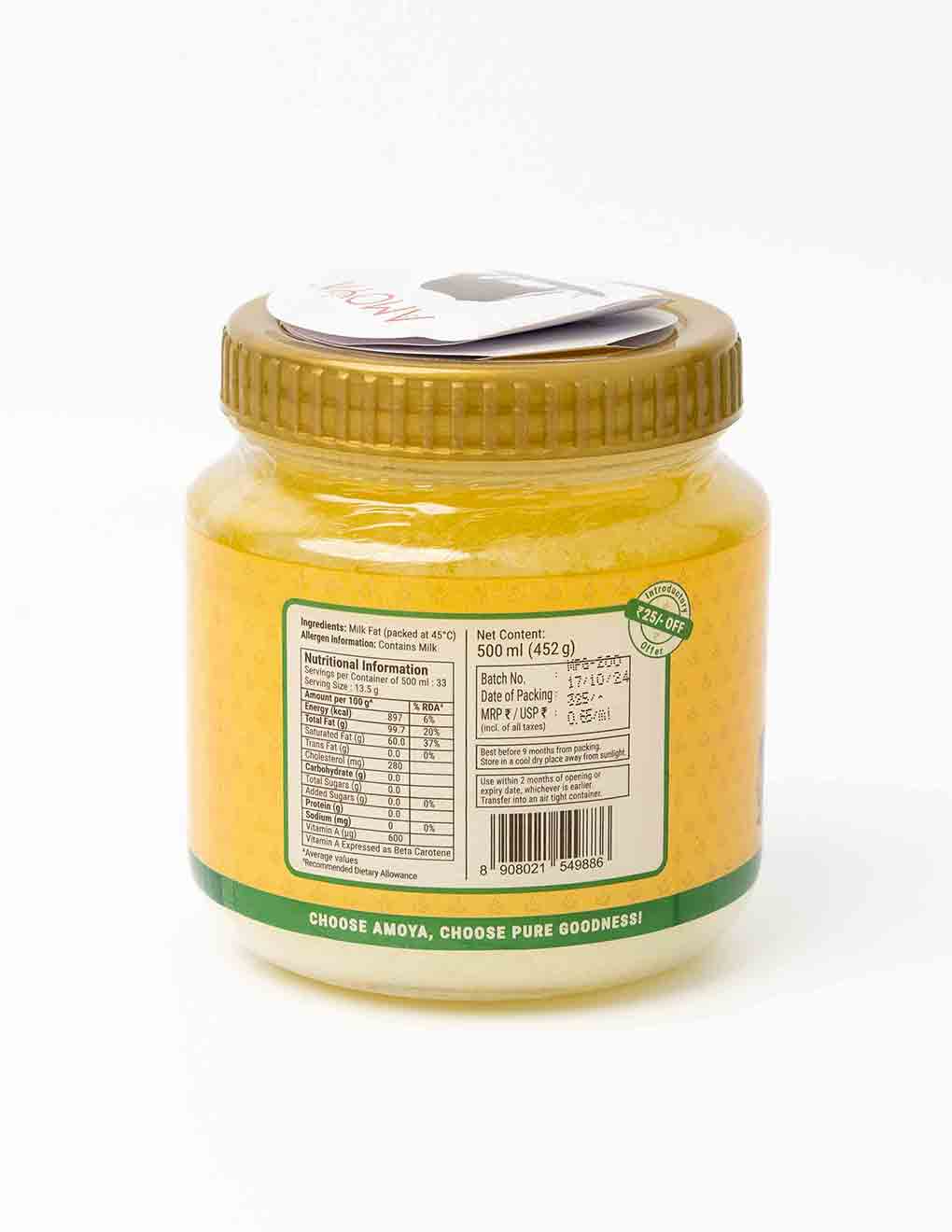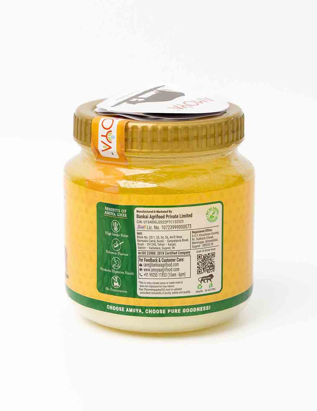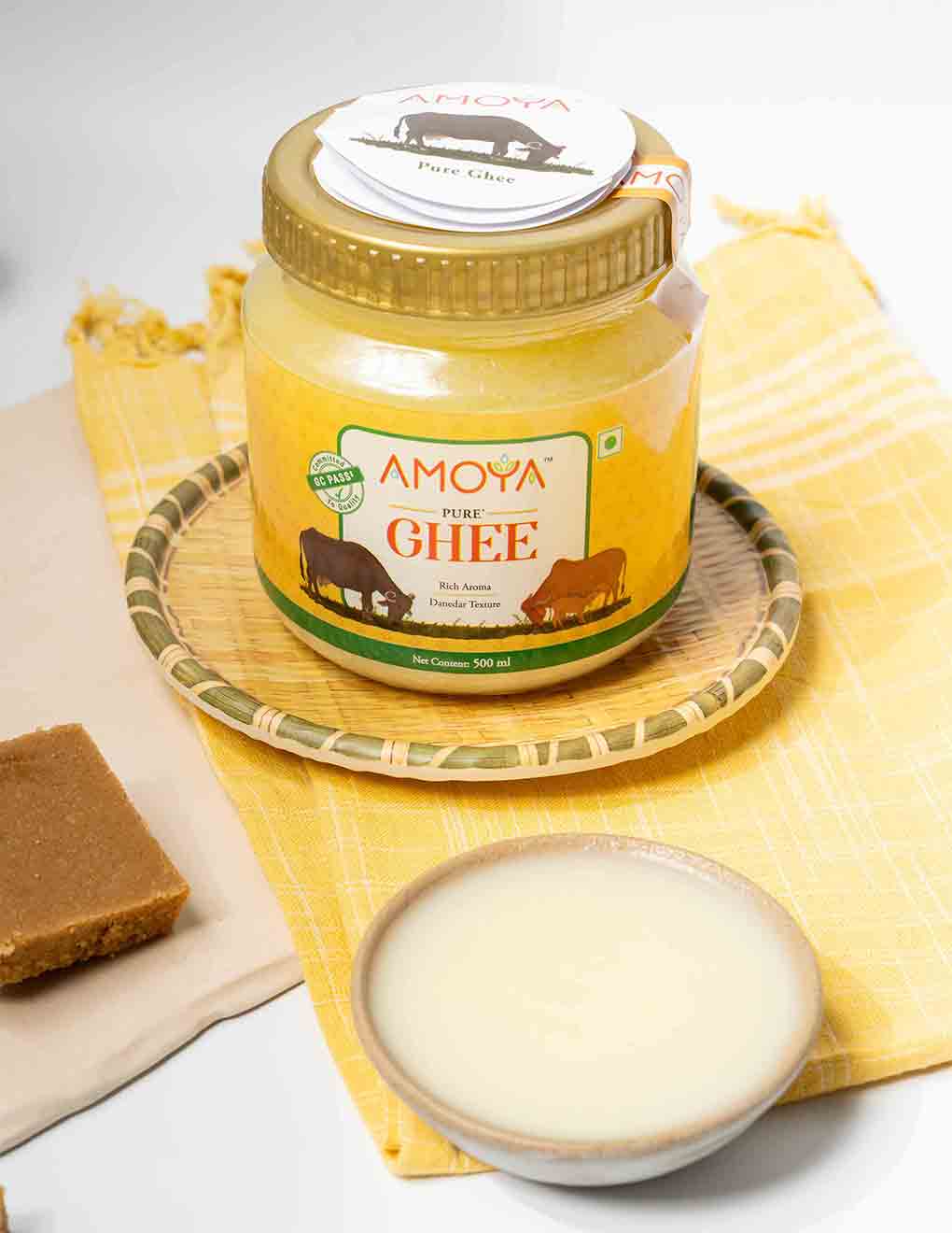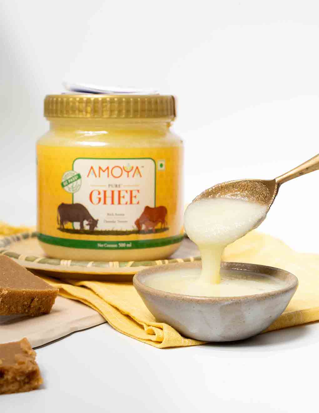 Amoya Pure Ghee is a mix of Cow milk and Buffalo milk which retains the rich quality and grainy texture of ghee. Perfecting the nutritional balance without compromising on the taste at a price that is accessible to all, this ghee is a perfect mix of purity and quality.